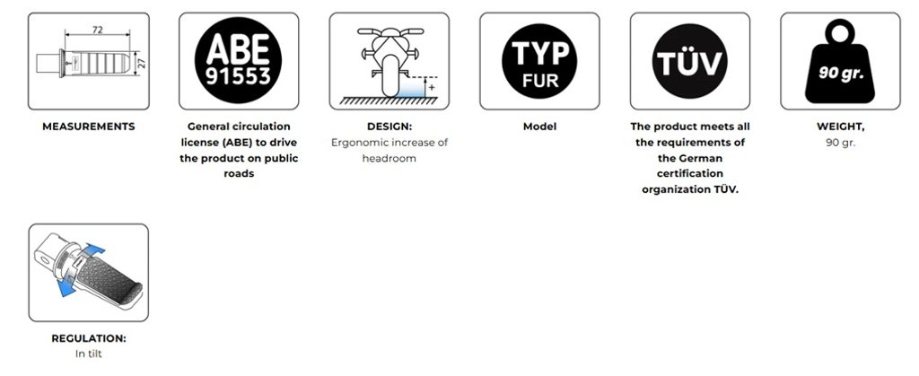 Mají délku 72 mm, šířku 27 mm a jejich hmotnost je pouhých 90 g. Ergonomie je klíčovým faktorem jejich konstrukce – jsou navrženy tak, aby zvyšovaly světlou výšku, což umožňuje větší úhel náklonu motocyklu. Jsou nastavitelné v náklonu a mají značky, které zajišťují vyšší přesnost při montáži.