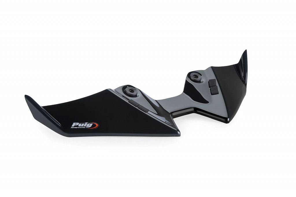 Z aerodynamického hlediska nový přední spoiler Naked od Puig usměrňuje vzduch proudící k chladiči zepředu a díky svému tvaru poskytuje téměř 2 kg přítlaku na přední kolo, čímž zároveň vytváří anti-wheelie efekt, anti-shimmie efekt (vyšší stabilita při vysokých rychlostech), větší stabilitu při brzdění a lepší chování při změnách směru jízdy.