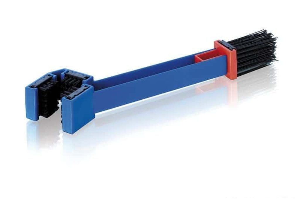 Kartáč, kterým zvládnete vyčistit řetěz doma v garáži a ulehčíte si tak údržbu motocyklu. Kartáč má dva různé konce se štětinami s vysokou odolností a různou tvrdostí. Jedna strana je navržena tak, aby se přizpůsobila tvaru řetězu a její krátké a silné štětiny snadno očistily nečistoty zapuštěné do řetězu. Druhá strana má delší a jemnější štětiny, které slouží k odstranění spadlých nečistot z ráfků, kyvné vidlice nebo brzdových třmenů.