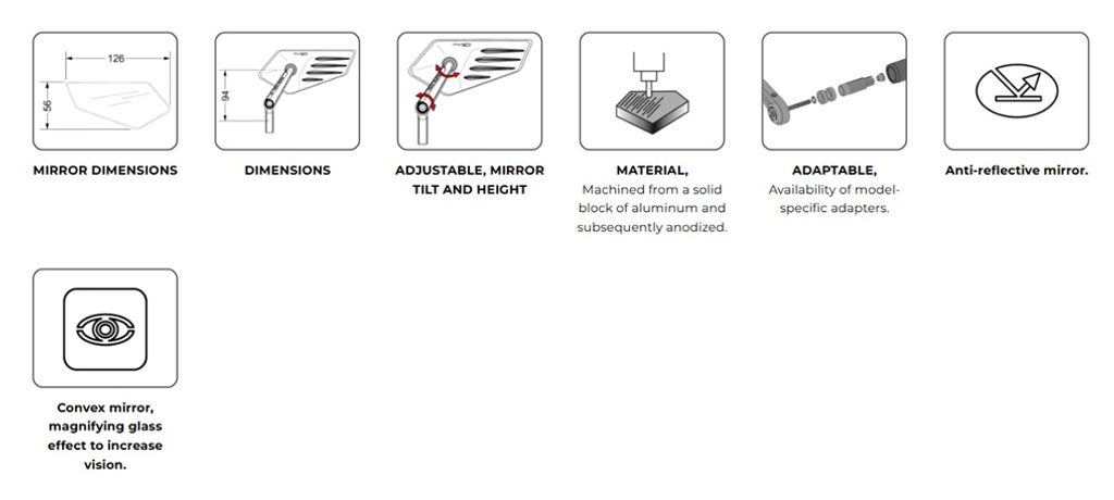 Neschválené zpětné zrcátko je navrženo k montáži na konec řídítek a nabízí funkční i estetické řešení, které se dokonale integruje s liniemi motocyklu. Ve srovnání s aktuálními modely přináší novou úroveň nastavení, která výrazně zlepšuje přizpůsobení individuálním preferencím jezdce. Tento systém umožňuje naklopení ramene zrcátka pro přesnější nastavení úhlu pohledu, přičemž zachovává možnost rotace vzhledem k řídítkům pro správnou orientaci. Konečné doladění je dosaženo prostřednictvím vysoce přesného kuličkového kloubu, který umožňuje jemné a bezpečné nastavení, zajišťuje stabilitu při jízdě a zabraňuje nežádoucím pohybům způsobeným vibracemi.